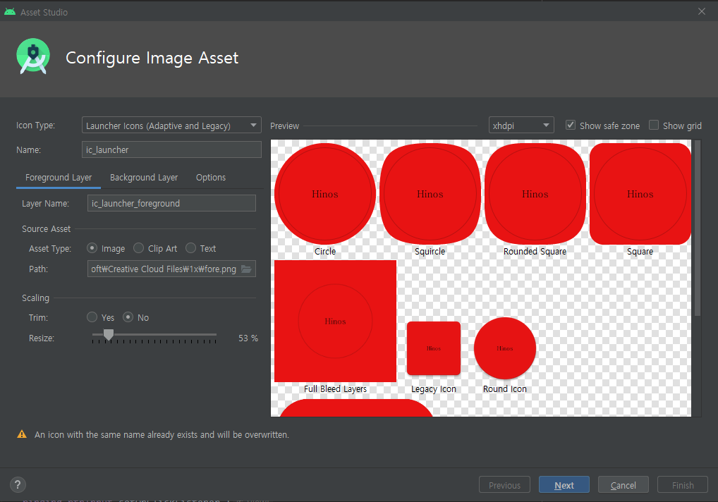안드로이드 스튜디오에서 프로젝트의 폴더를 오른쪽 클릭 -> New -> ImageAsset을 누르면 Configure Image Asset 창이 뜬다.