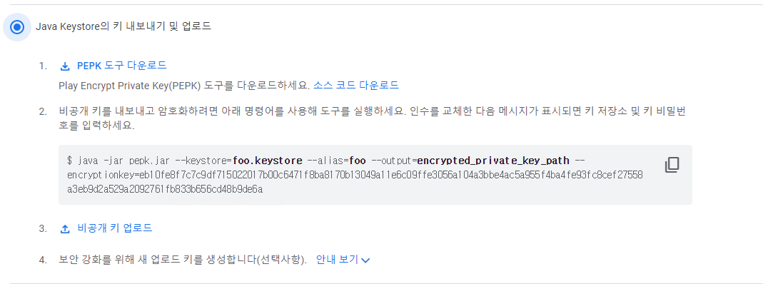2번 째 Java Keystore의 키 내보내기 및 업로드 라디오 버튼을 선택해준다.