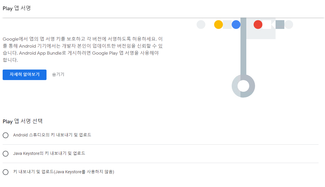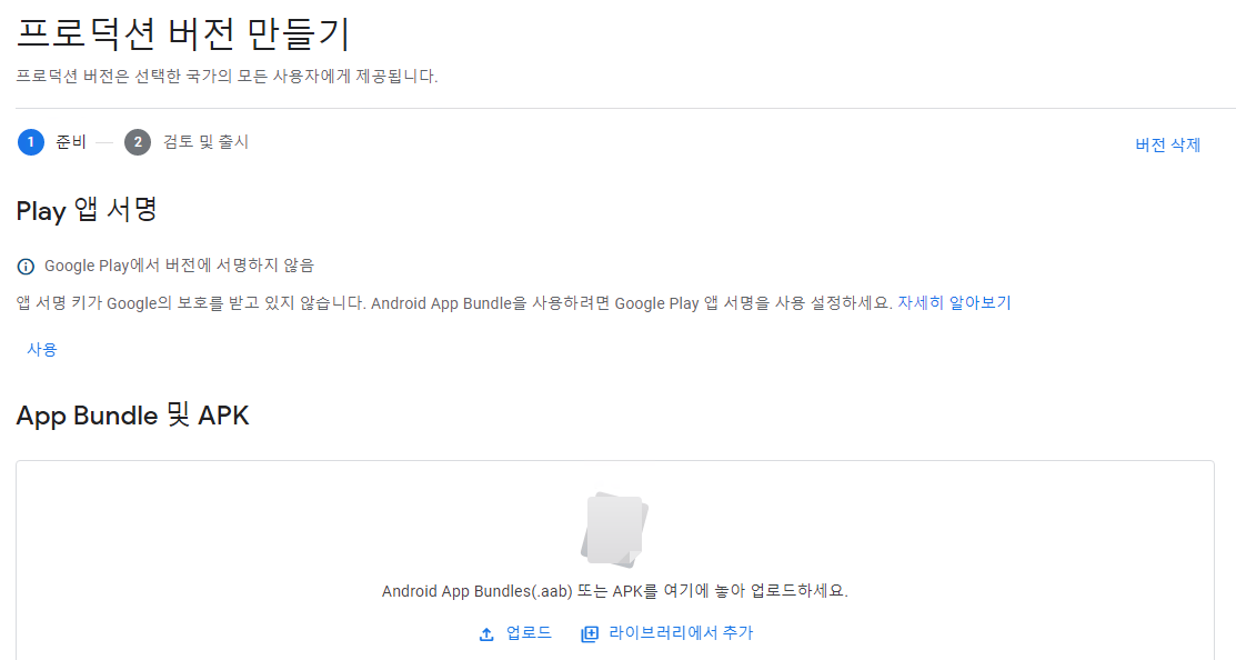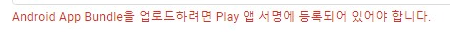 구글 콘솔에 새버전 만들기를 클릭하면 앱 서명을 하라고 상단에 뜨게 된다.
