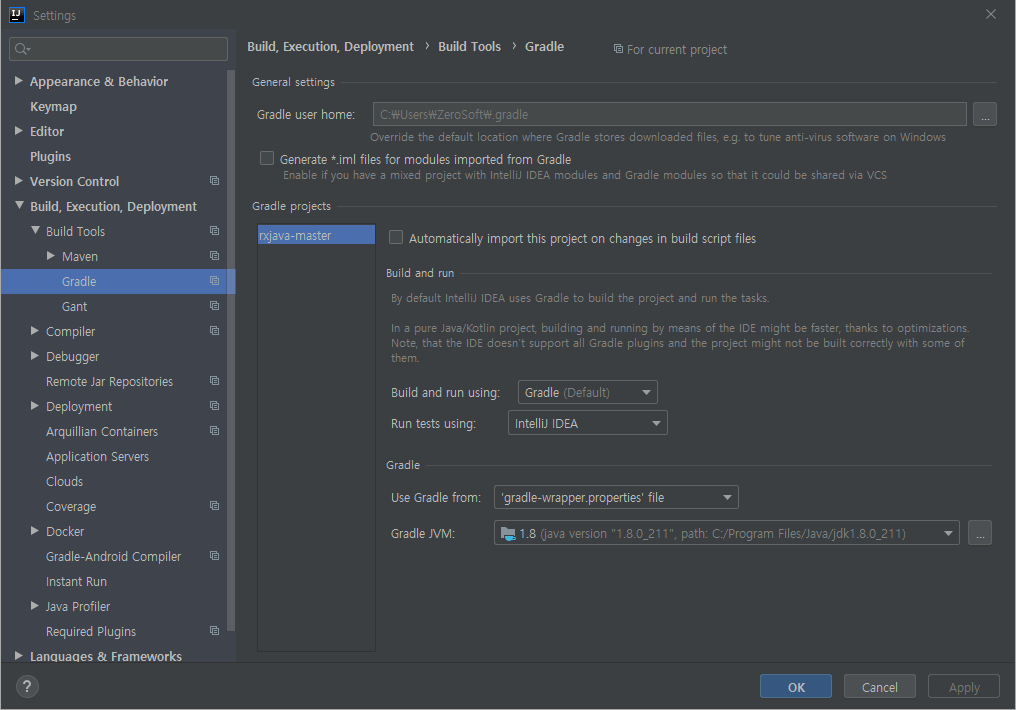 Ctrl + Alt + S -> Build, Execution, Deployment -> Build Tools -> Gradle에서