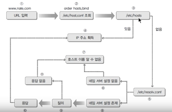 - /etc/hosts 파일에 www.nate.com의 IP 주소가 없다면 /etc/resov.conf 파일을 확인해서 'nameserver 네임서버 IP' 부분이 있는지 확인하게 된다.