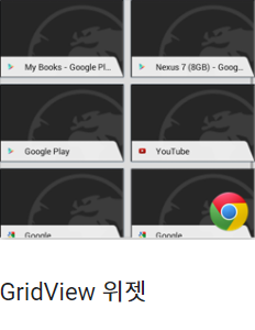 안드로이드 위젯은 RemoteViews 객체를 기반으로 하기 때문에 사용할 수 있는 뷰 객체들이 제한되어 있다.