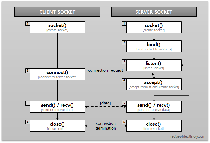 accept : 클라이언트의 연결 요청을 받아들여 소켓 간 연결을 수립, 이전에 생성한 socket이 아닌 accept에서 새로운 소켓이 생성된다. 해당 소켓을 통해 데이터 통신이 이루어짐