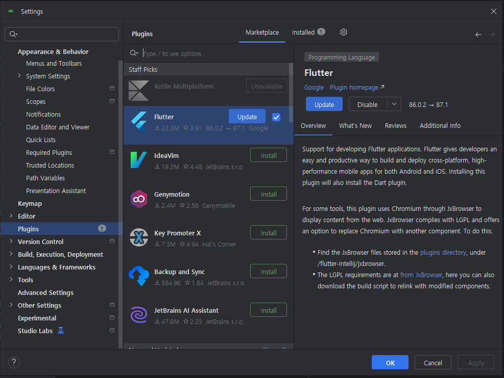 - 검색창에 Flutter 입력 후 설치