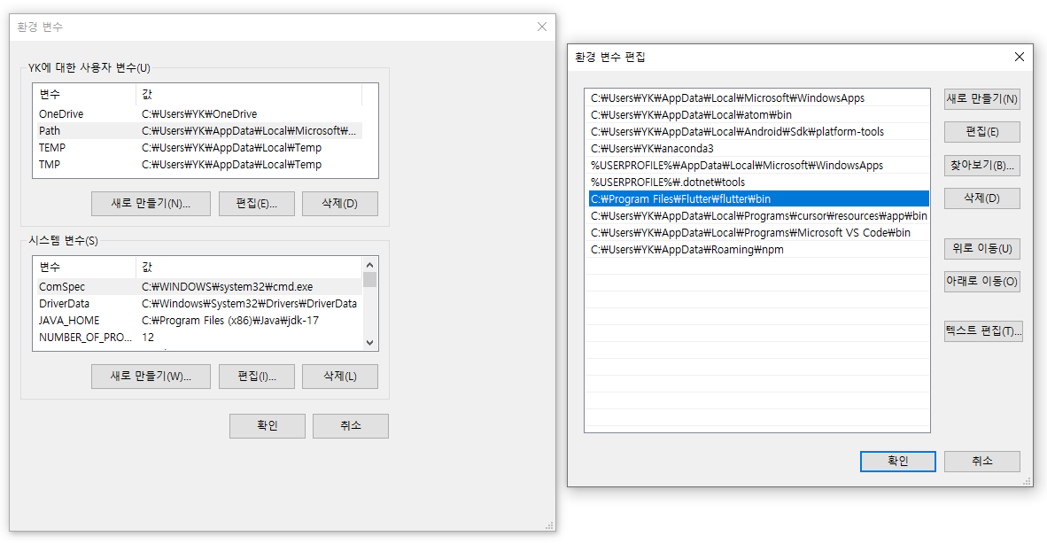 - Path 항목에 아래 경로 추가: C:\Program Files\Flutter\flutter\bin